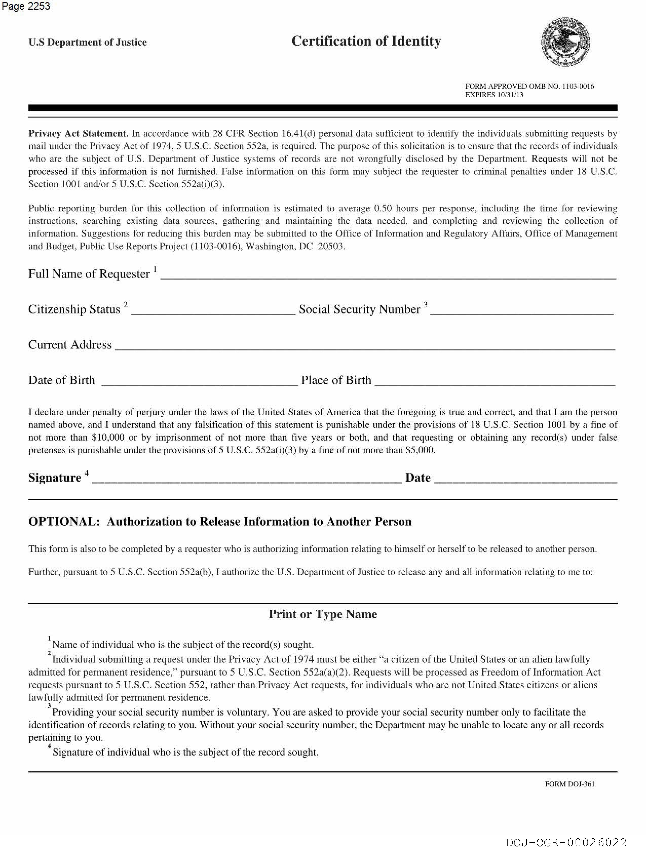 U.S Department of Justice Certification of Identity