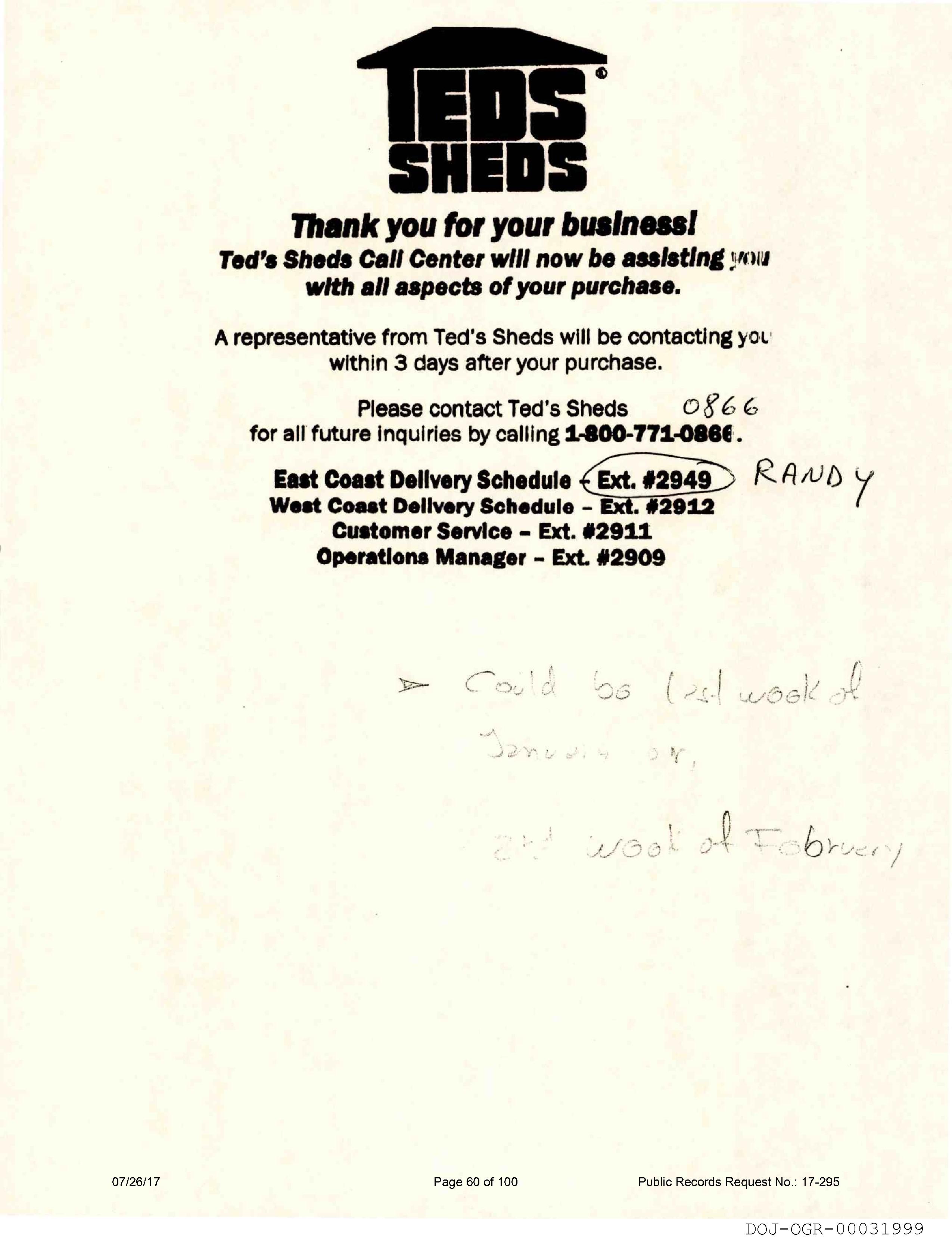 A representative from Ted's Sheds will be contacting you