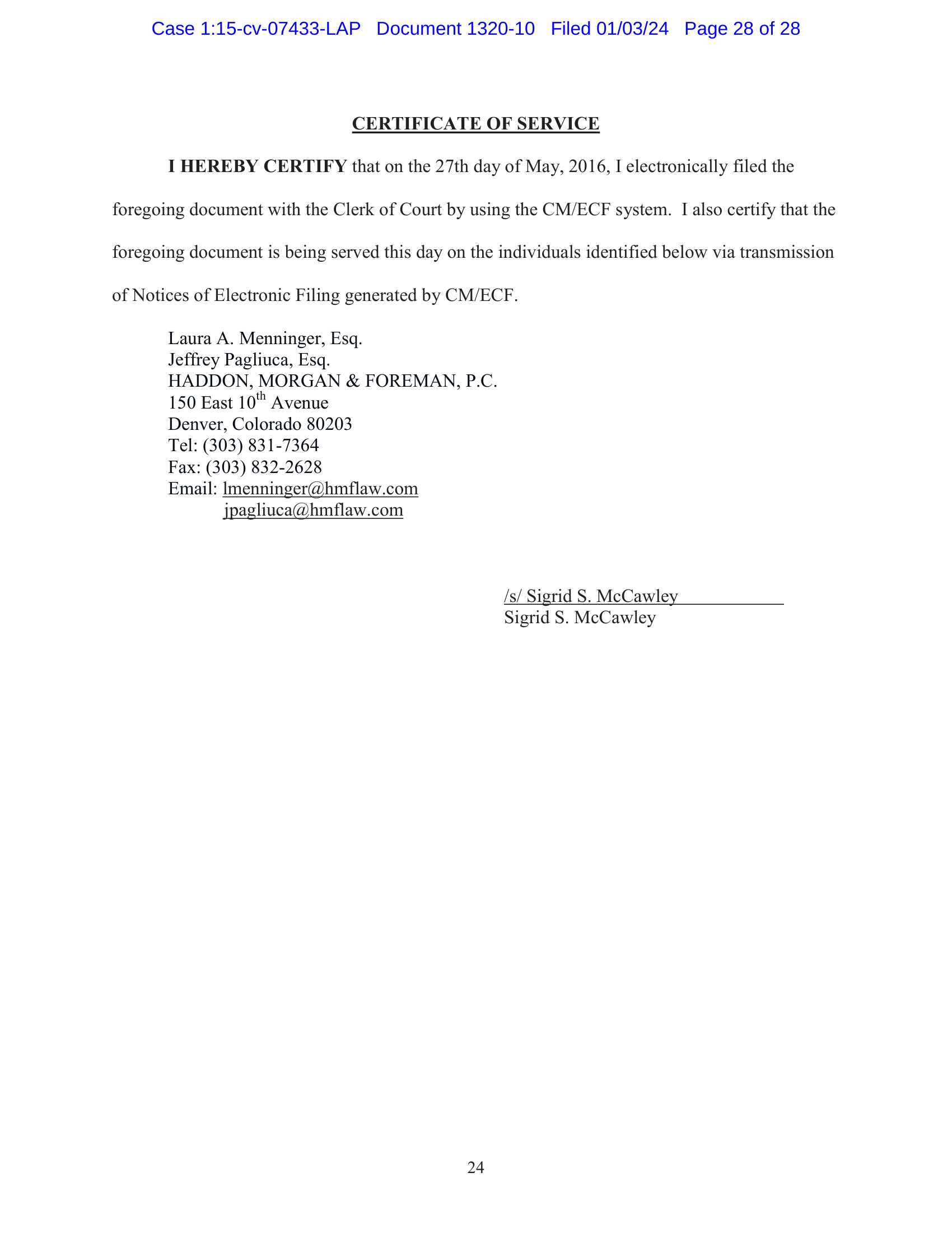 I HEREBY CERTIFY that on the 27th day of May, 2016, I electronically filed the