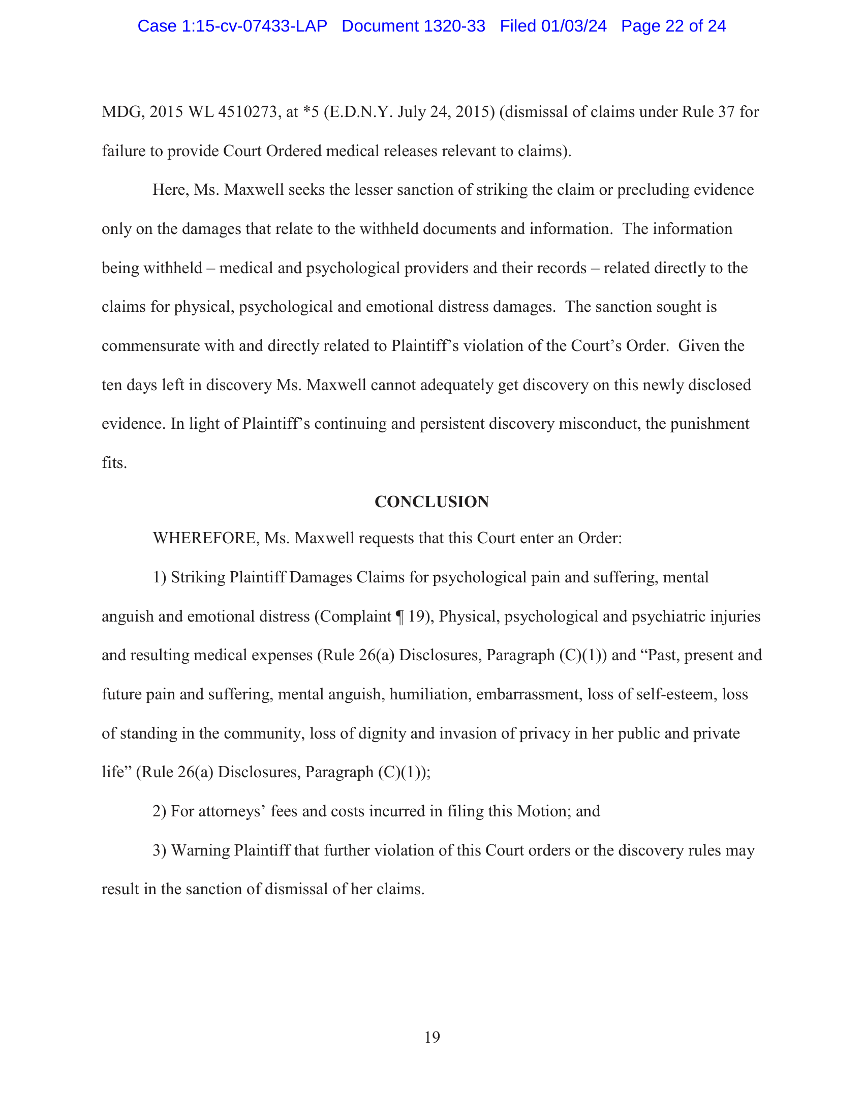 MDG, 2015 WL 4510273, at *5 (E.D.N.Y. July 24, 2015) (dismissal of claims under Rule 37 for