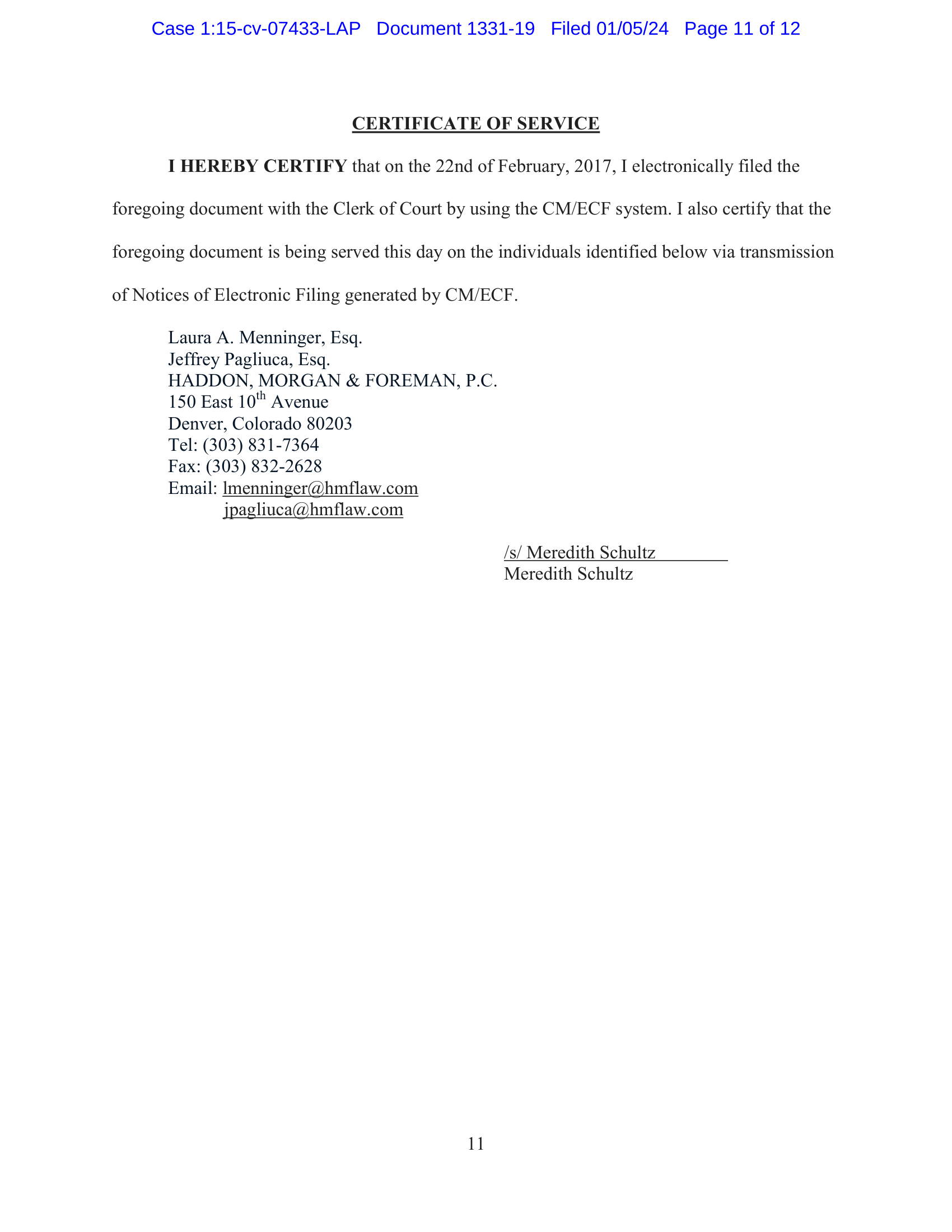 I HEREBY CERTIFY that on the 22nd of February, 2017, I electronically filed the