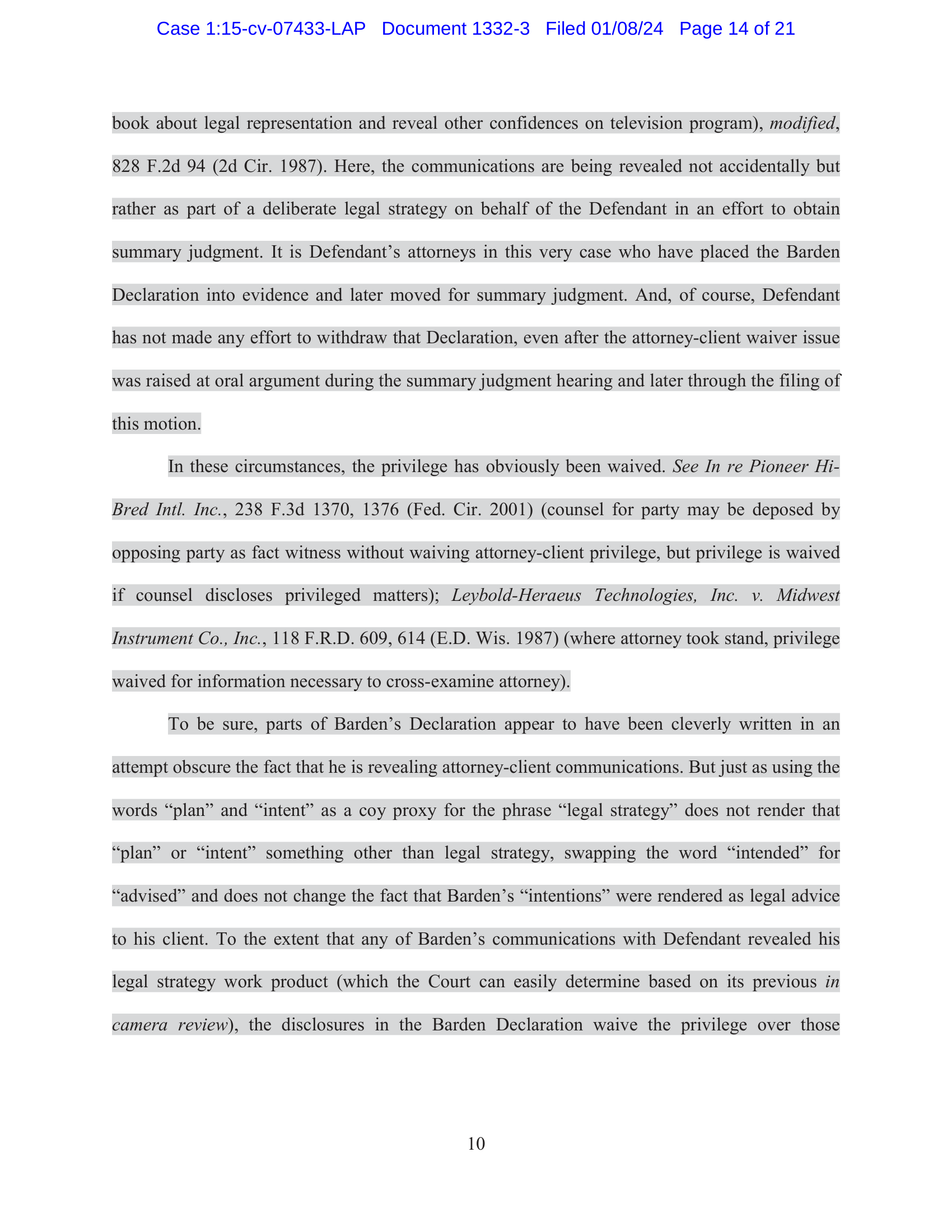 In these circumstances, the privilege has obviously been waived. See In re Pioneer Hi-