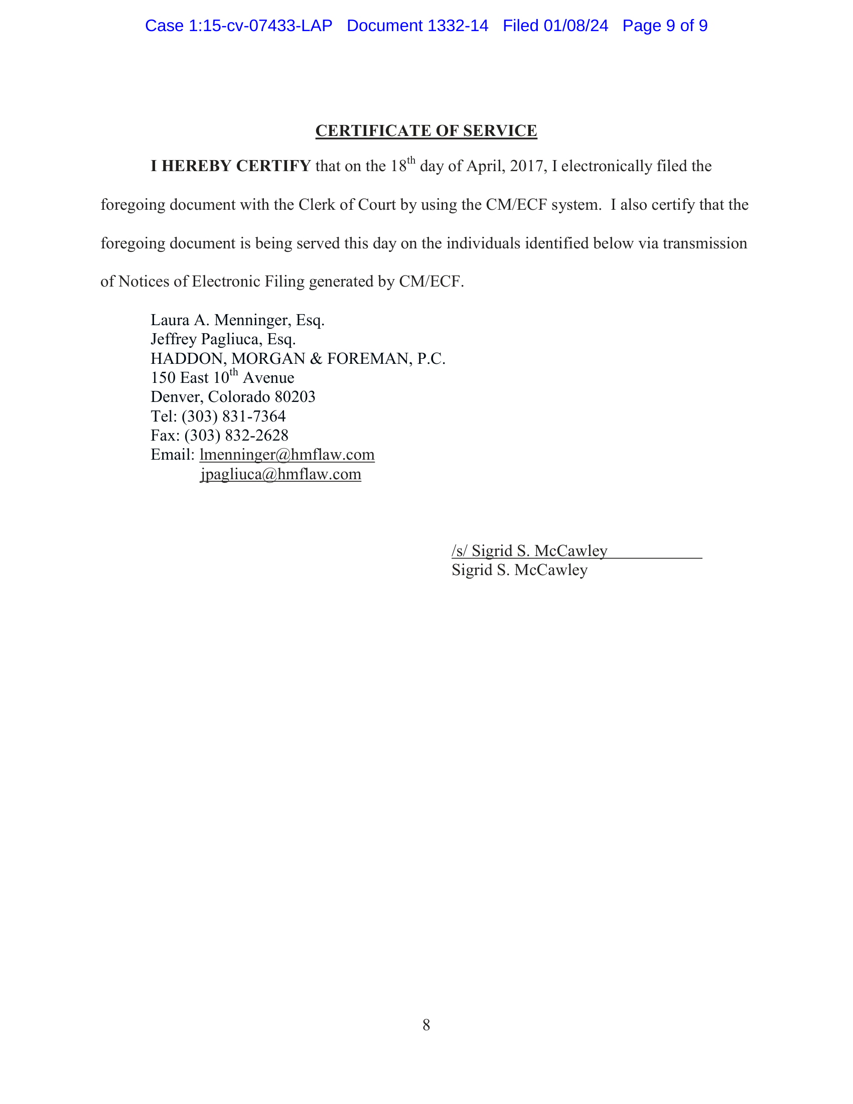 I HEREBY CERTIFY that on the 18" day of April, 2017, I electronically filed the