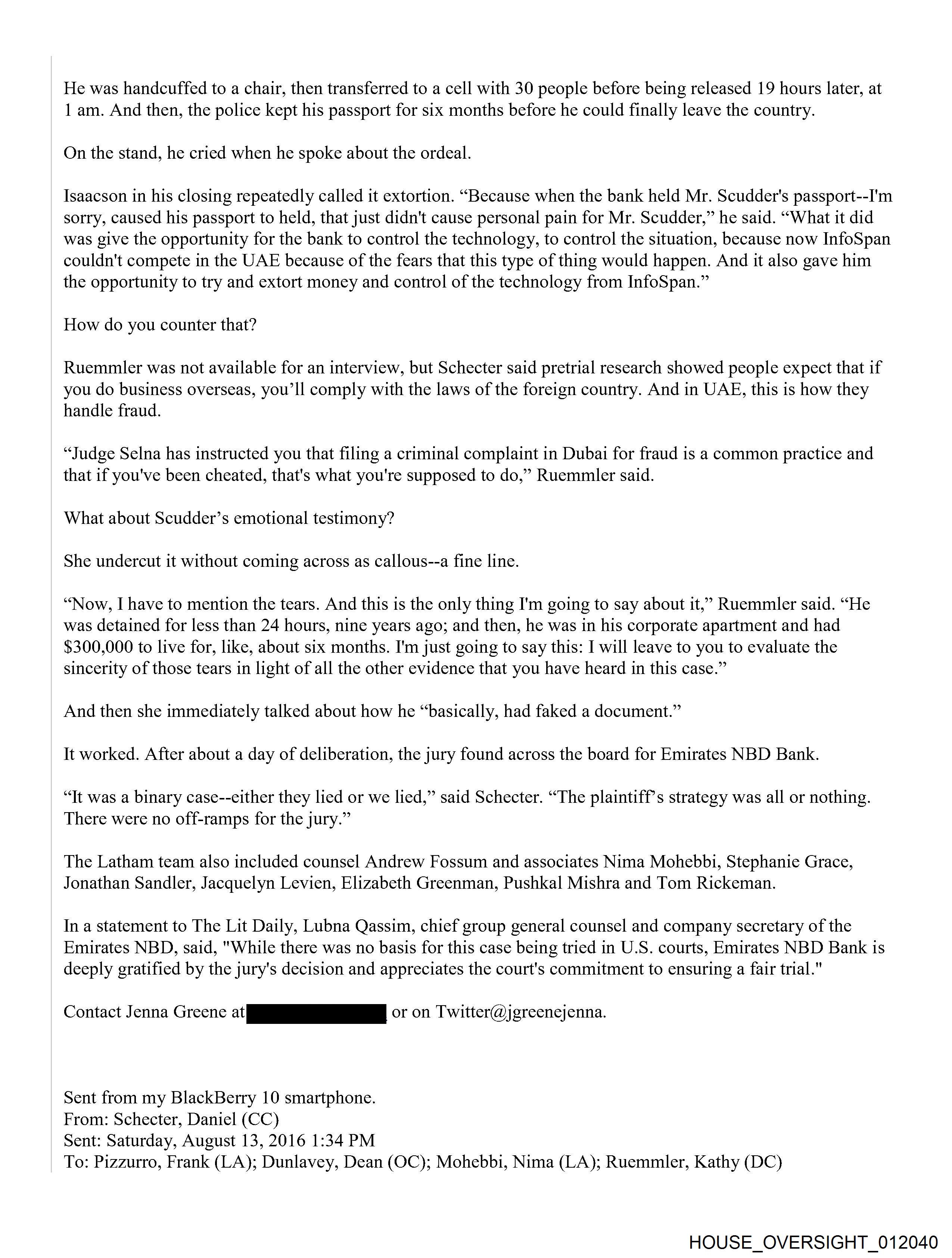 It worked. After about a day of deliberation, the jury found across the board for Emirates NBD Bank.