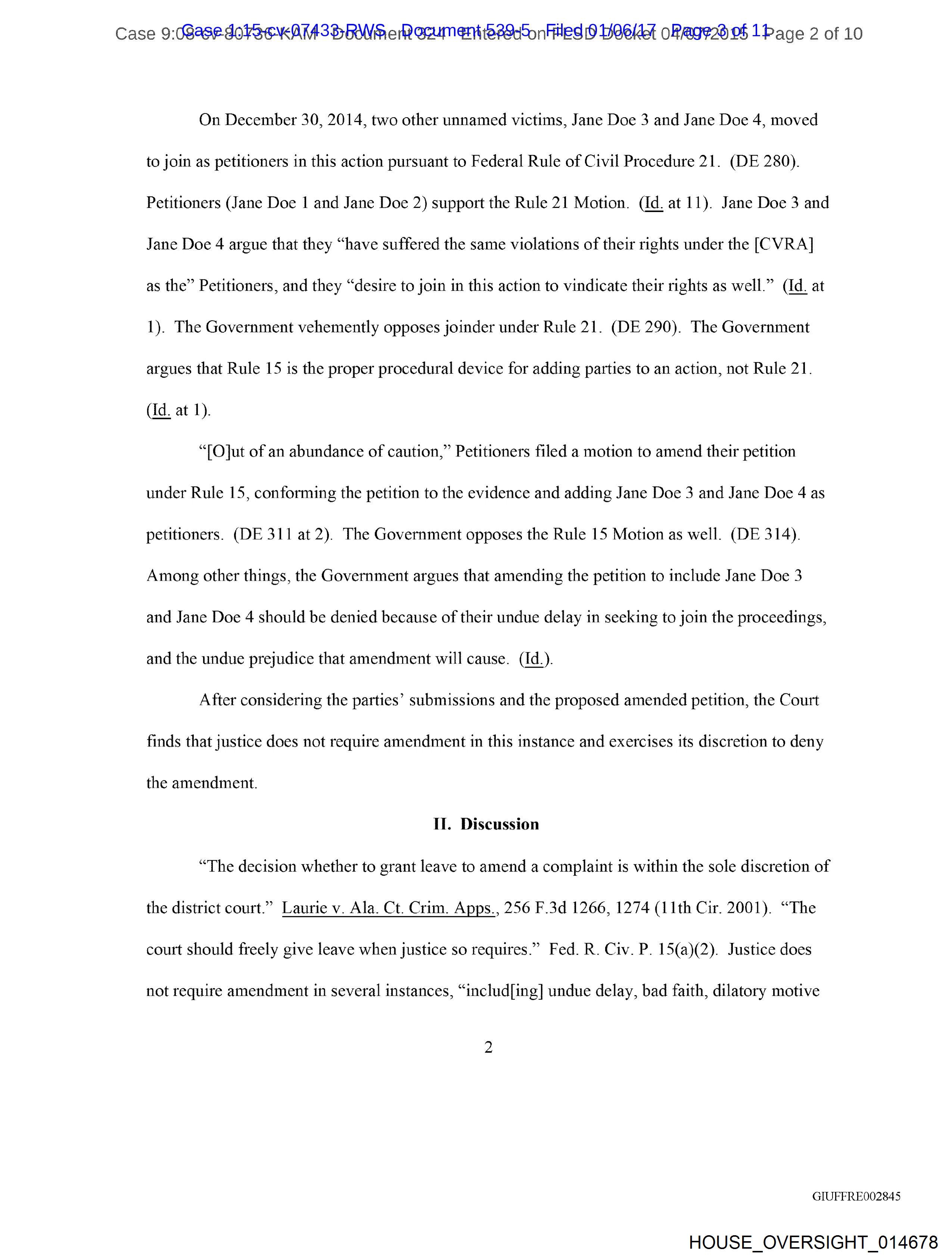 petitioners. (DE 311 at 2). The Government opposes the Rule 15 Motion as well. (DE 314).