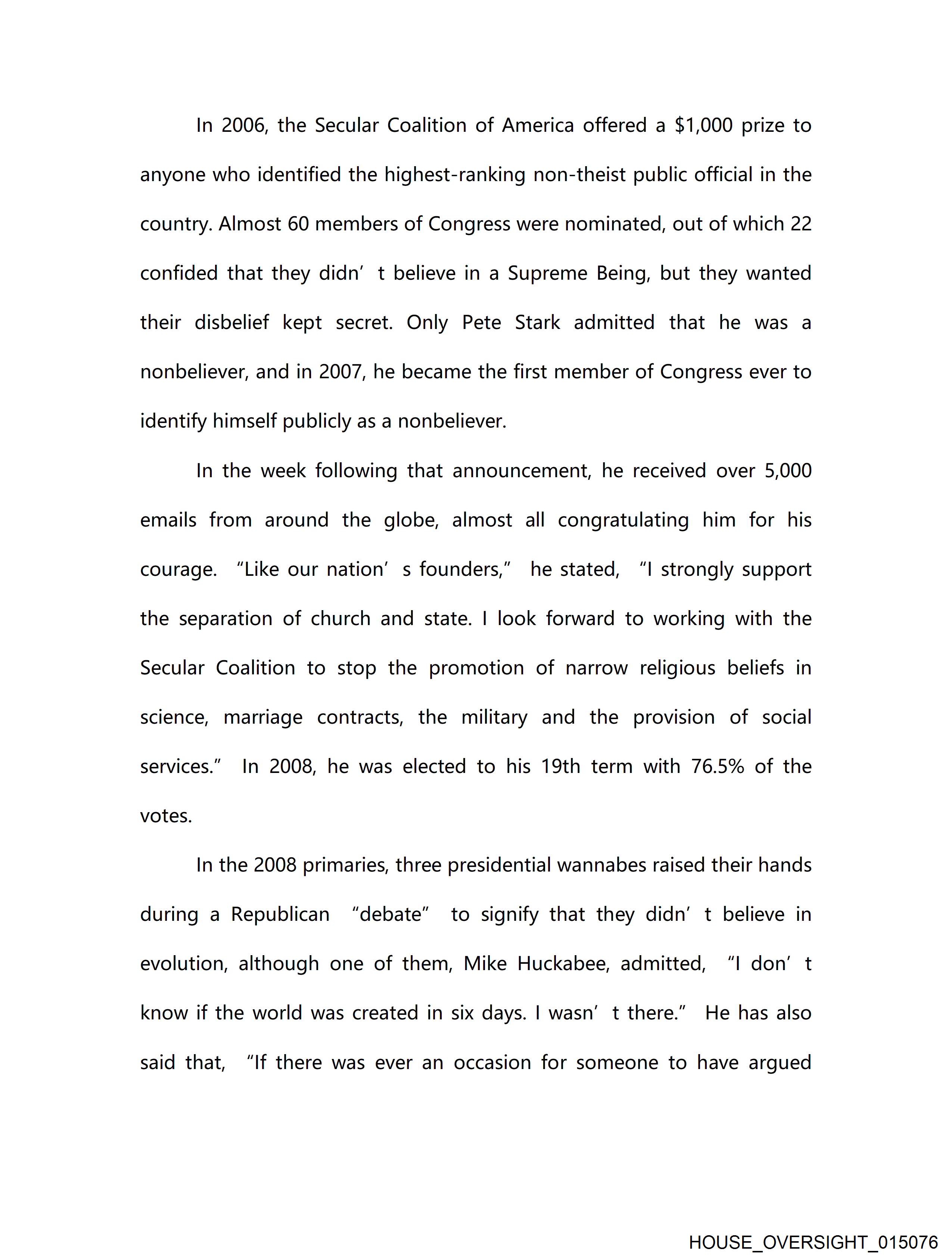 nonbeliever, and in 2007, he became the first member of Congress ever to