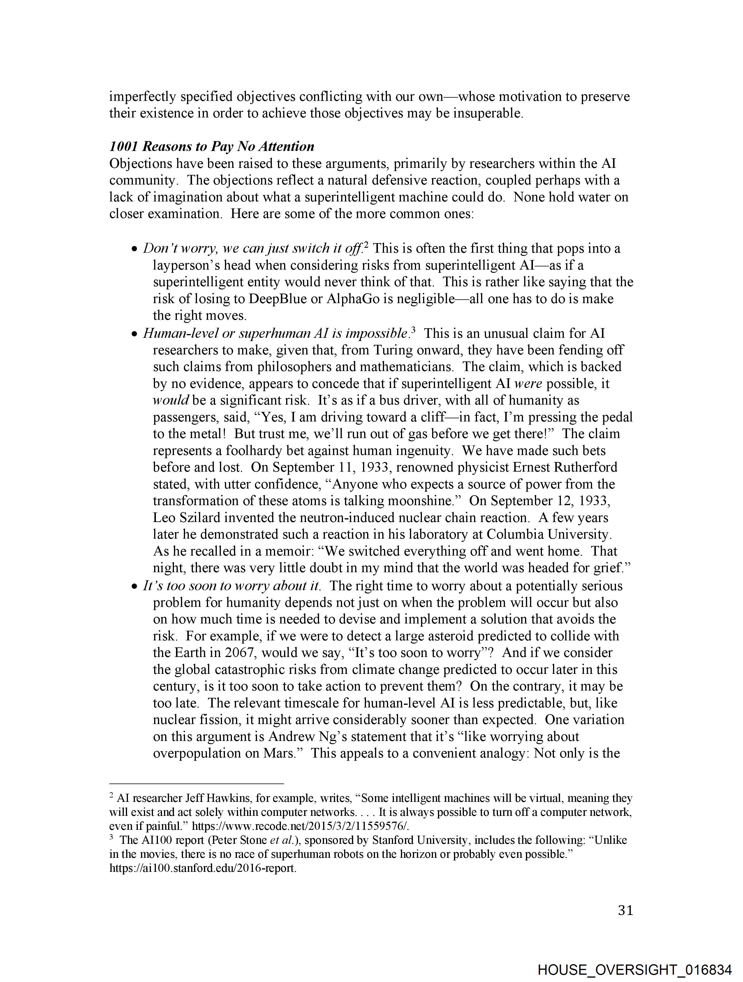 3 The AI100 report (Peter Stone et al.), sponsored by Stanford University, includes the following: “Unlike