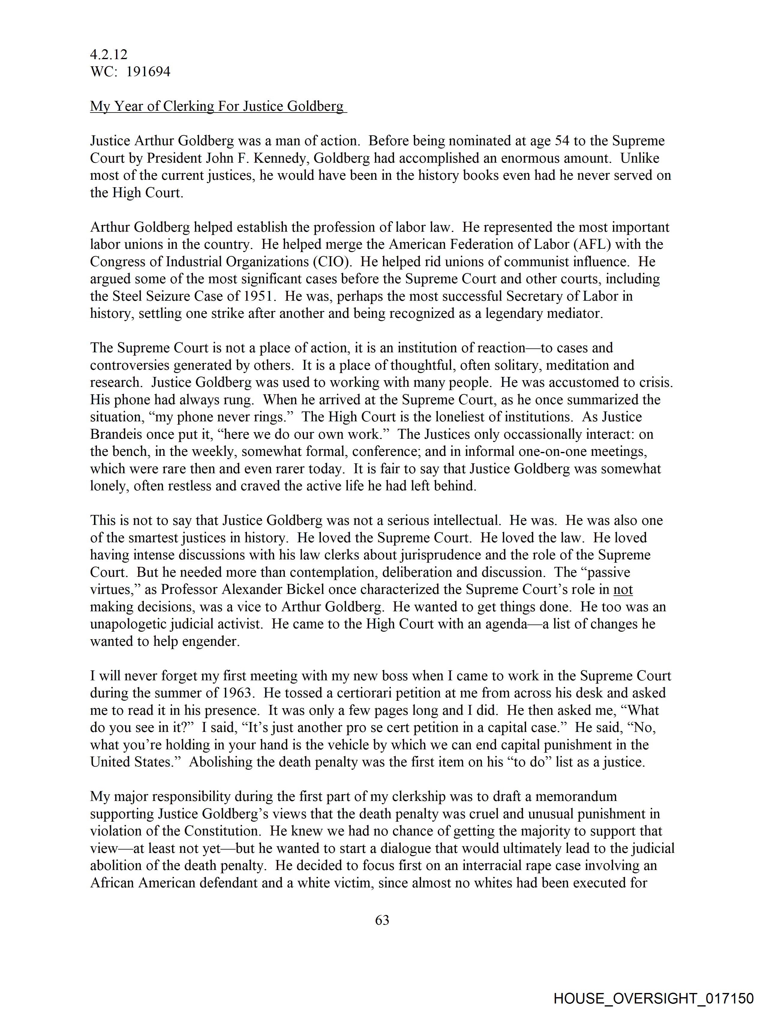 research. Justice Goldberg was used to working with many people. He was accustomed to crisis.