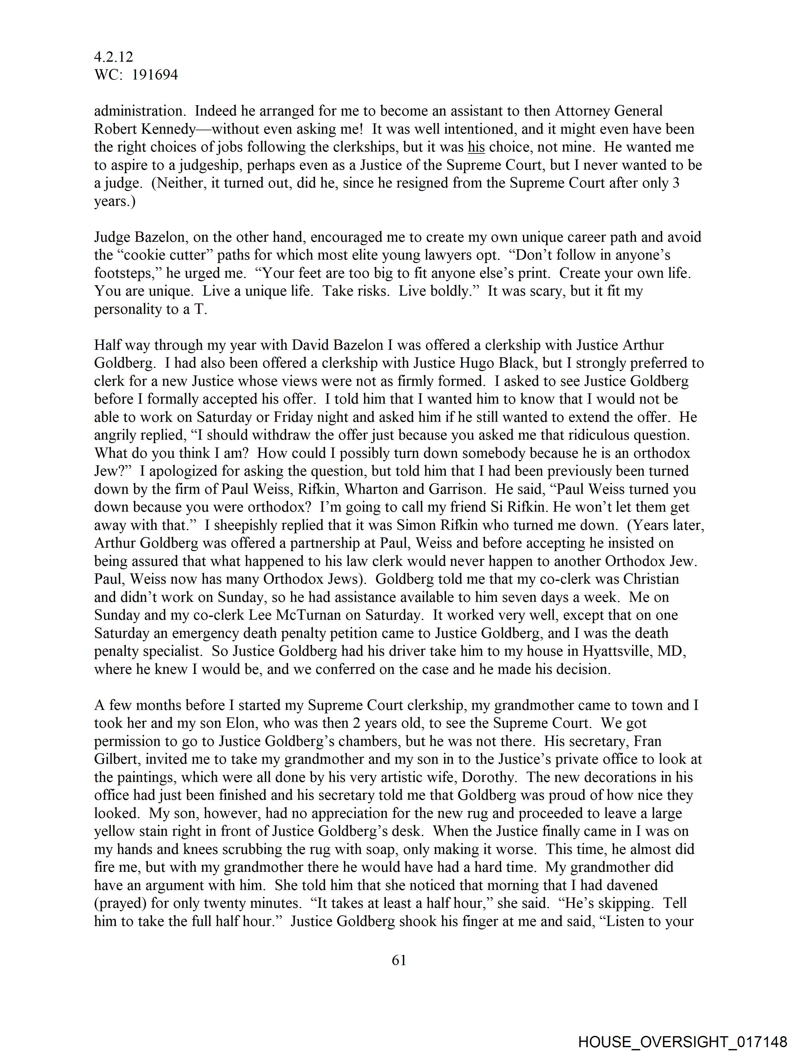 yellow stain right in front of Justice Goldberg’s desk. When the Justice finally came in I was on