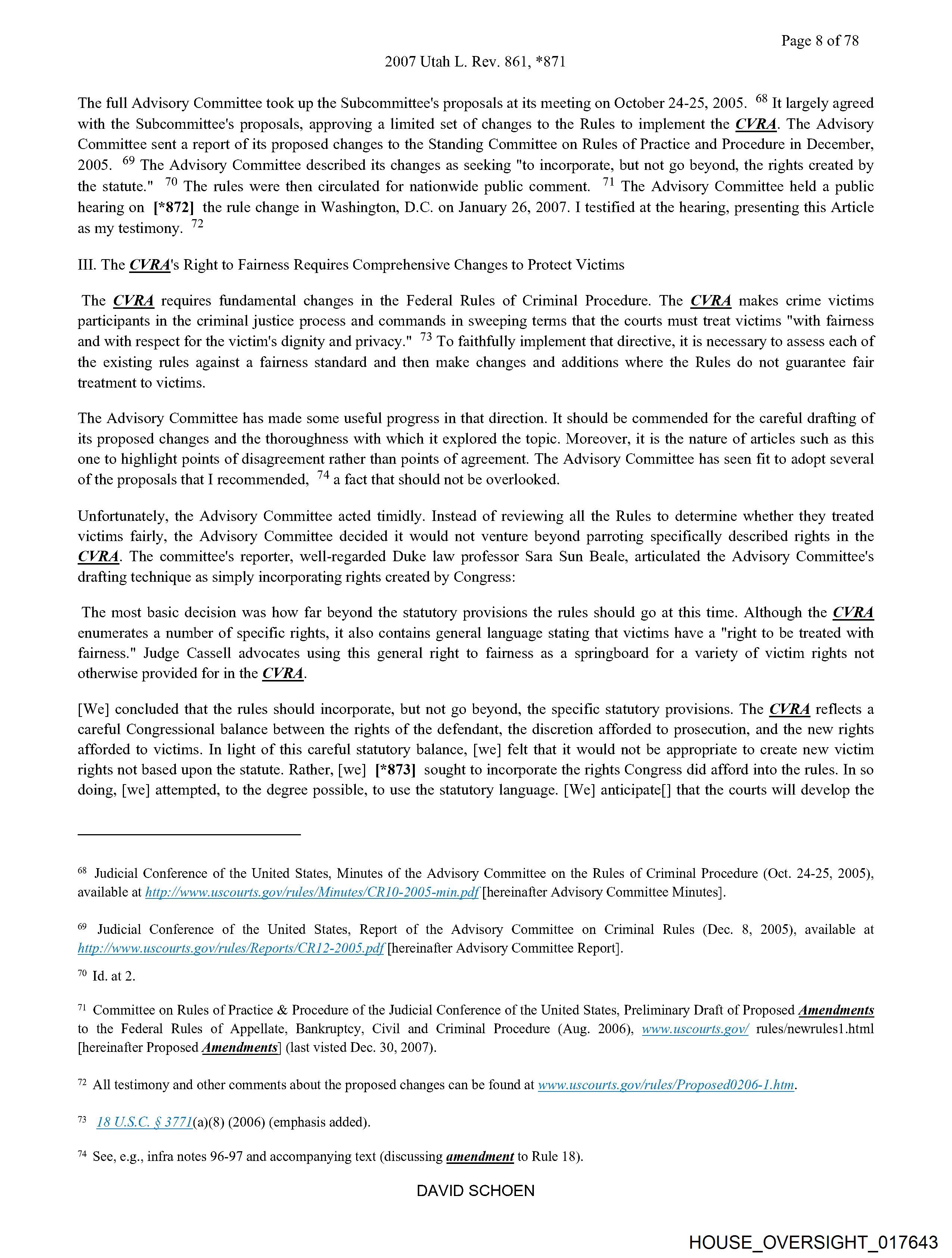 CVRA. The committee's reporter, well-regarded Duke law professor Sara Sun Beale, articulated the Advisory Committee's