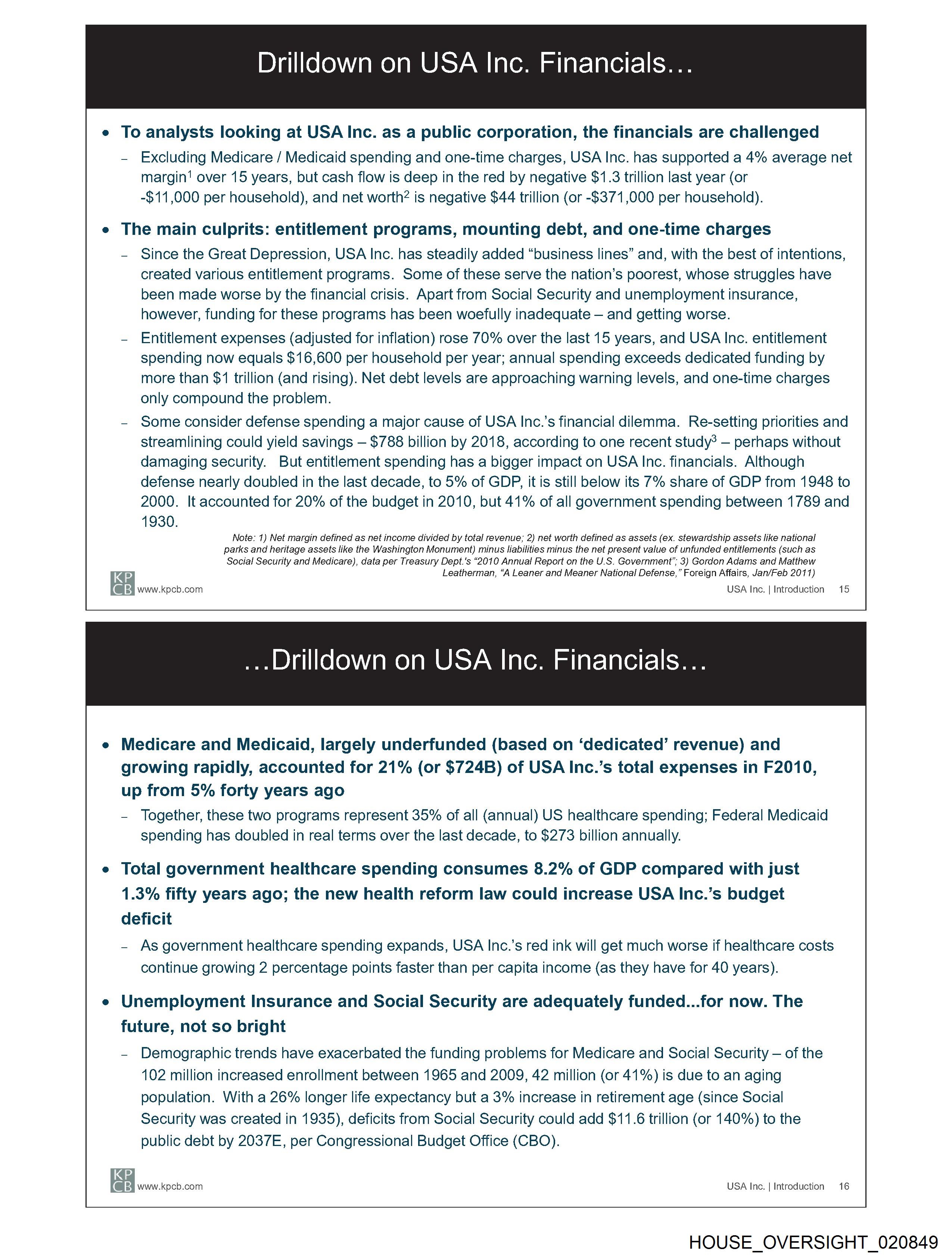 - Entitlement expenses (adjusted for inflation) rose 70% over the last 15 years, and USA Inc. entitlement
