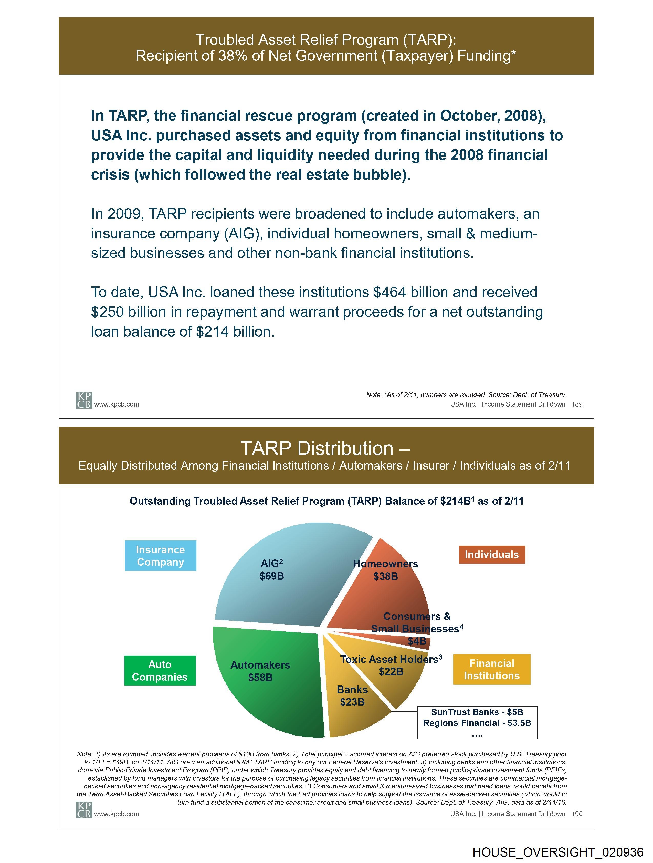 to 1/11 = $49B, on 1/14/11, AIG drew an additional $20B TARP funding to buy out Federal Reserve’s investment. 3) Including banks and other financial institutions;