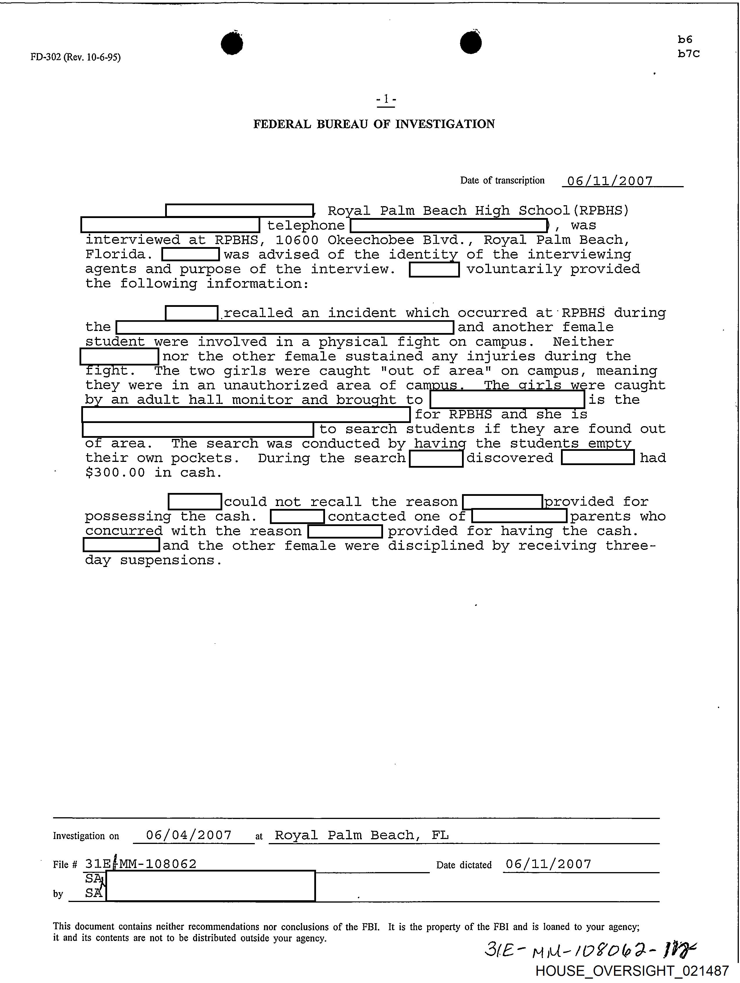 Investigation on 06/04/2007 at Royal Palm Beach, FL