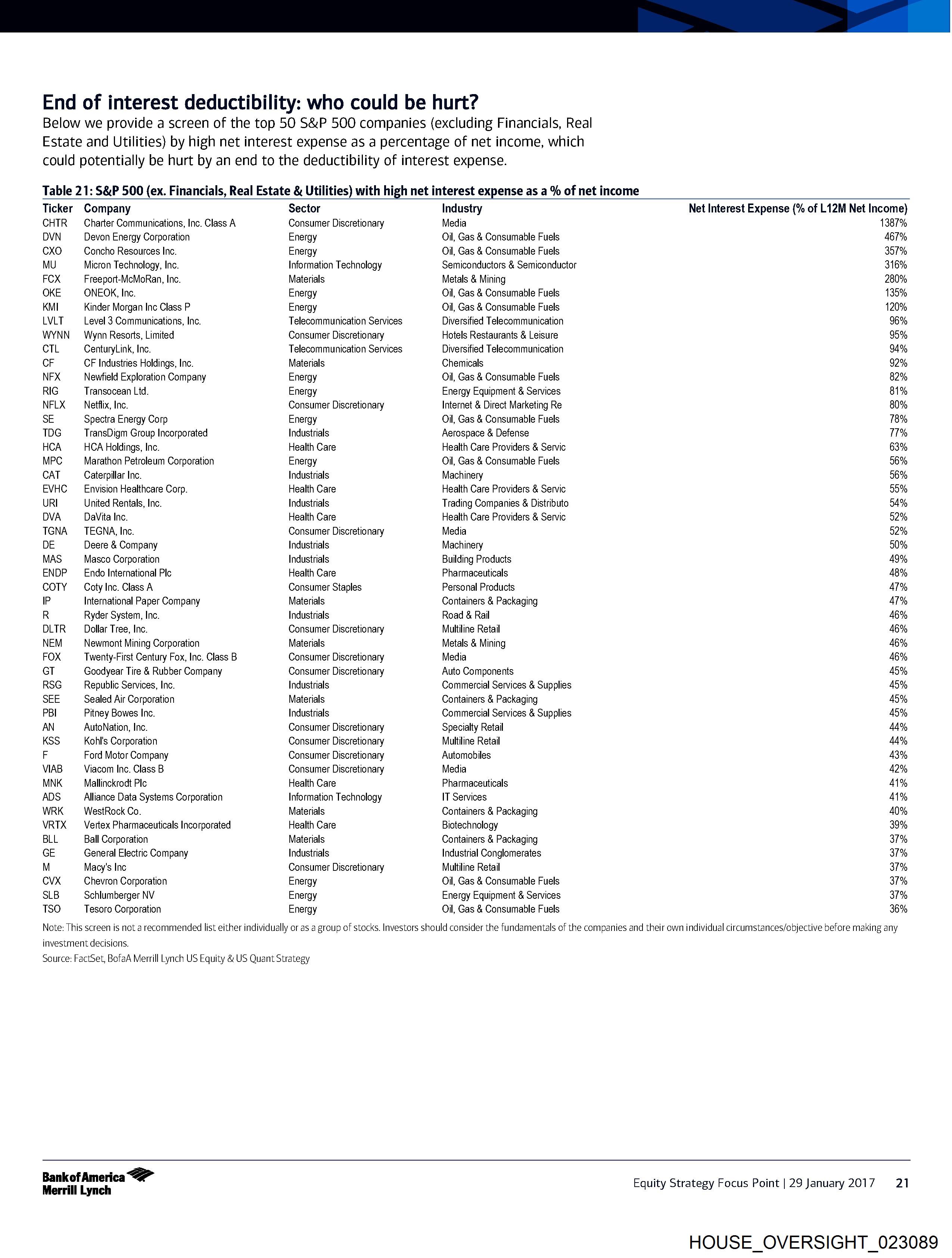 Table 21: S&P 500 (ex. Financials, Real Estate & Utilities) with high net interest expense as a % of net income