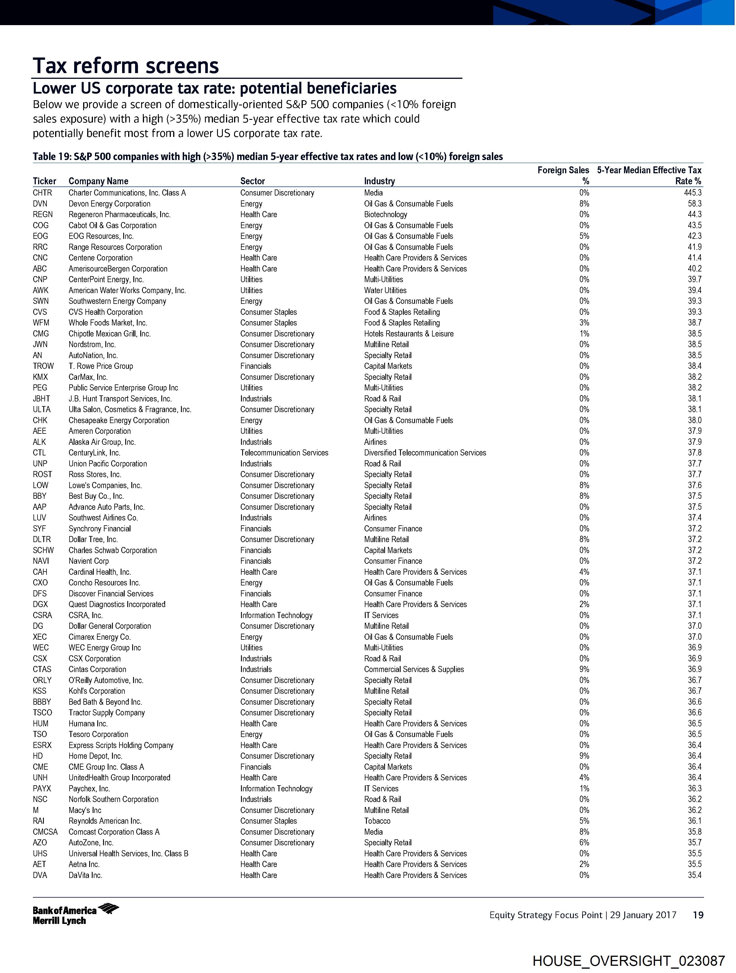 Table 19: S&P 500 companies with high (>35%) median 5-year effective tax rates and low (<10%) foreign sales