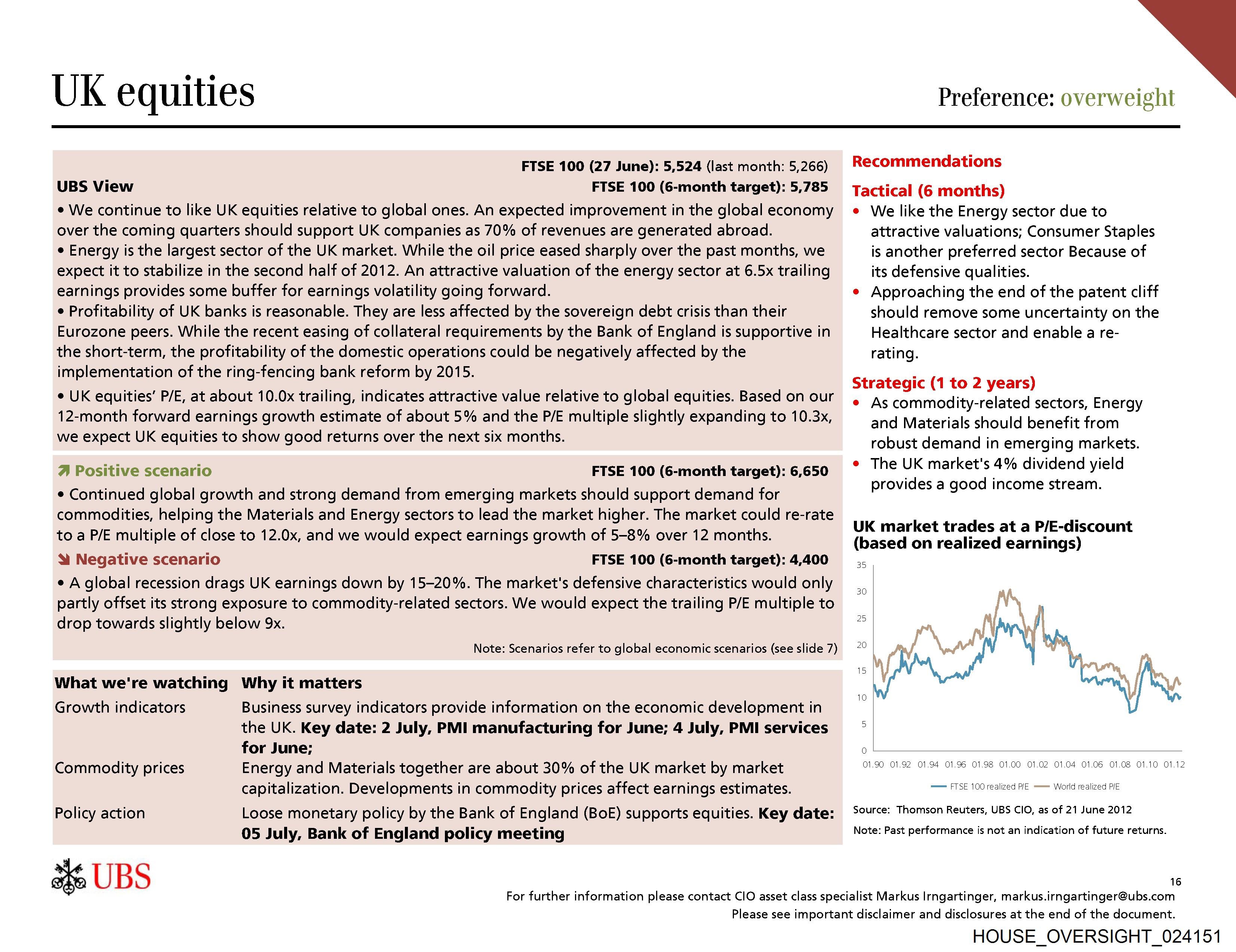 ¢ We continue to like UK equities relative to global ones. An expected improvement in the global economy