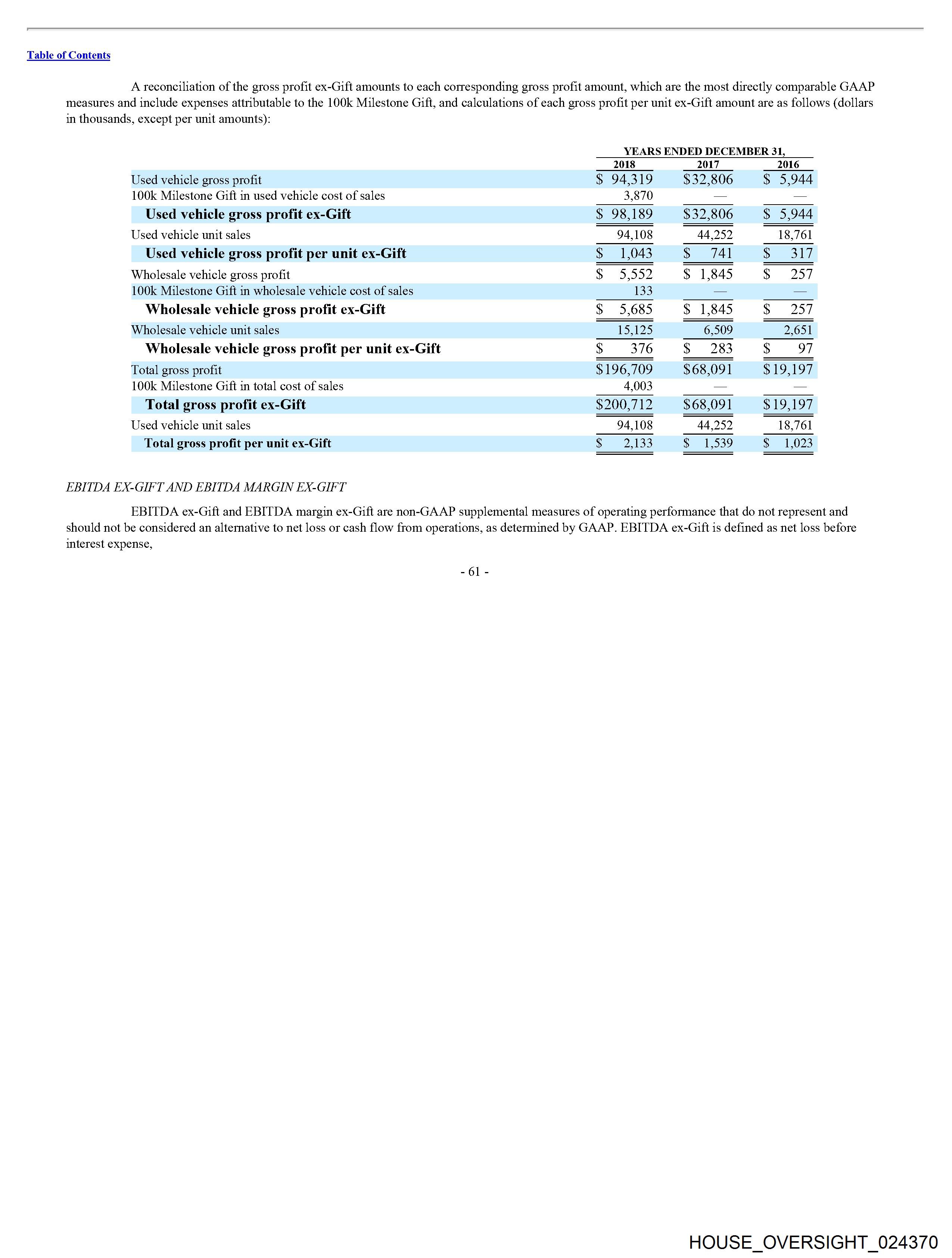 measures and include expenses attributable to the 100k Milestone Gift, and calculations of each gross profit per unit ex-Gift amount are as follows (dollars