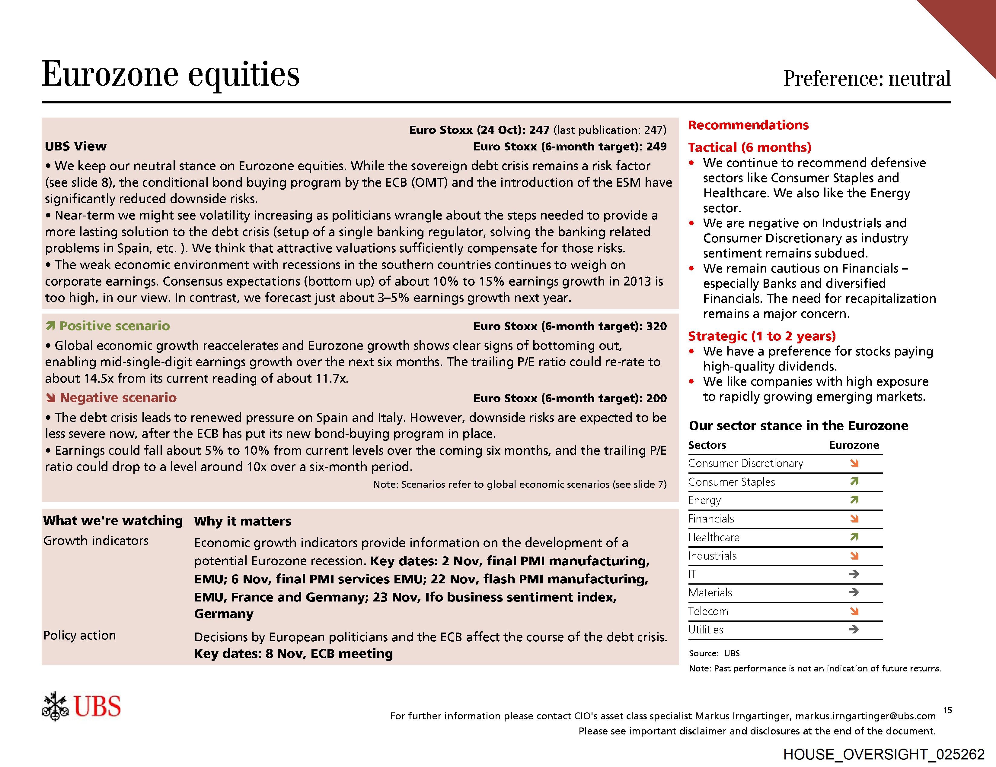 ¢ We keep our neutral stance on Eurozone equities. While the sovereign debt crisis remains a risk factor
