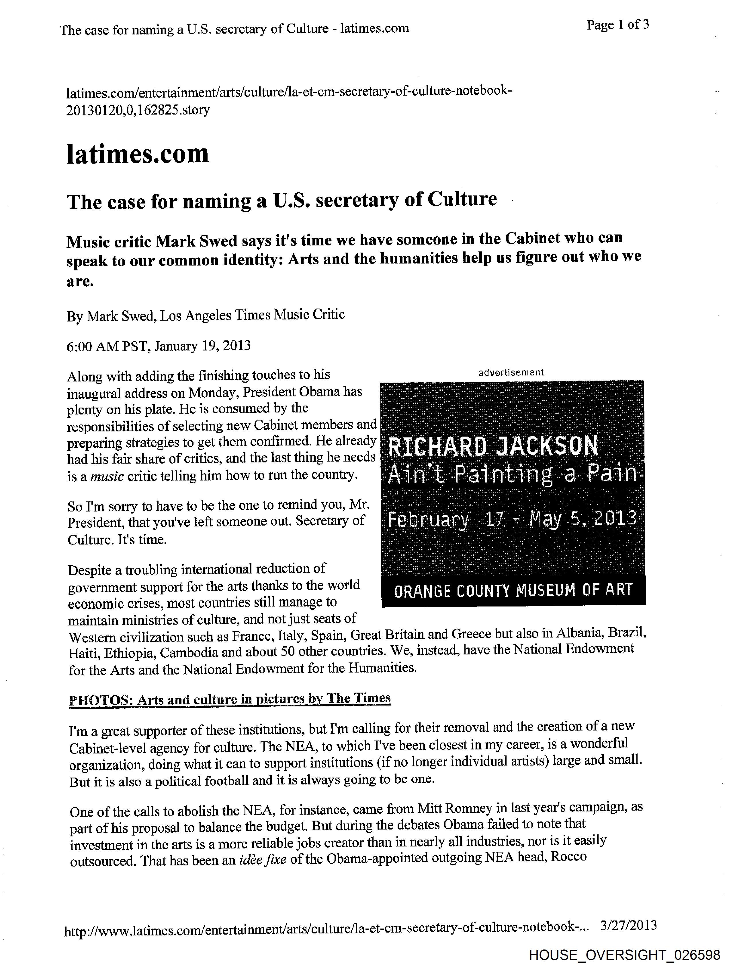 The case for naming a U.S. secretary of Culture - latimes.com Page ] of 3