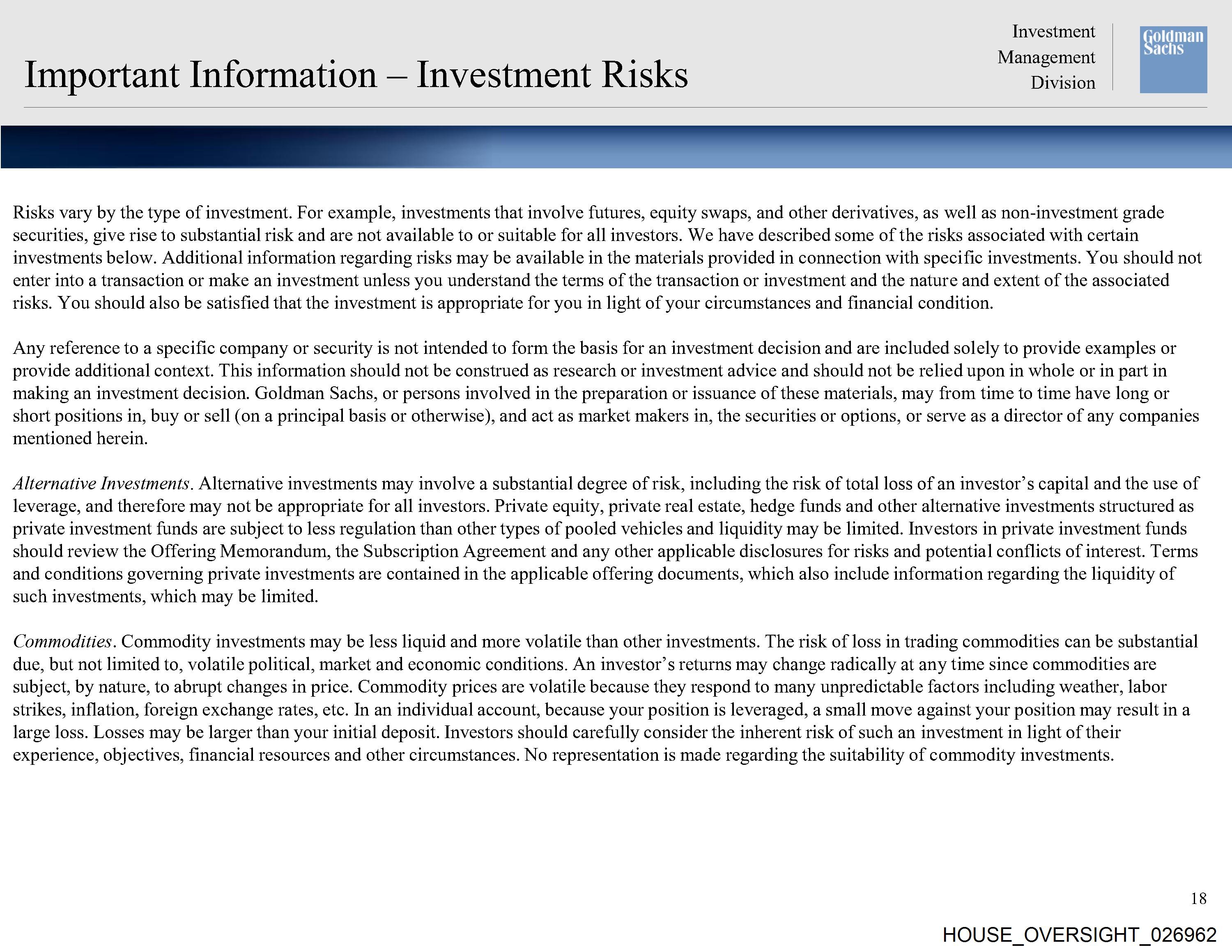 Alternative Investments. Alternative investments may involve a substantial degree of risk, including the risk of total loss of an investor’s capital and the use of