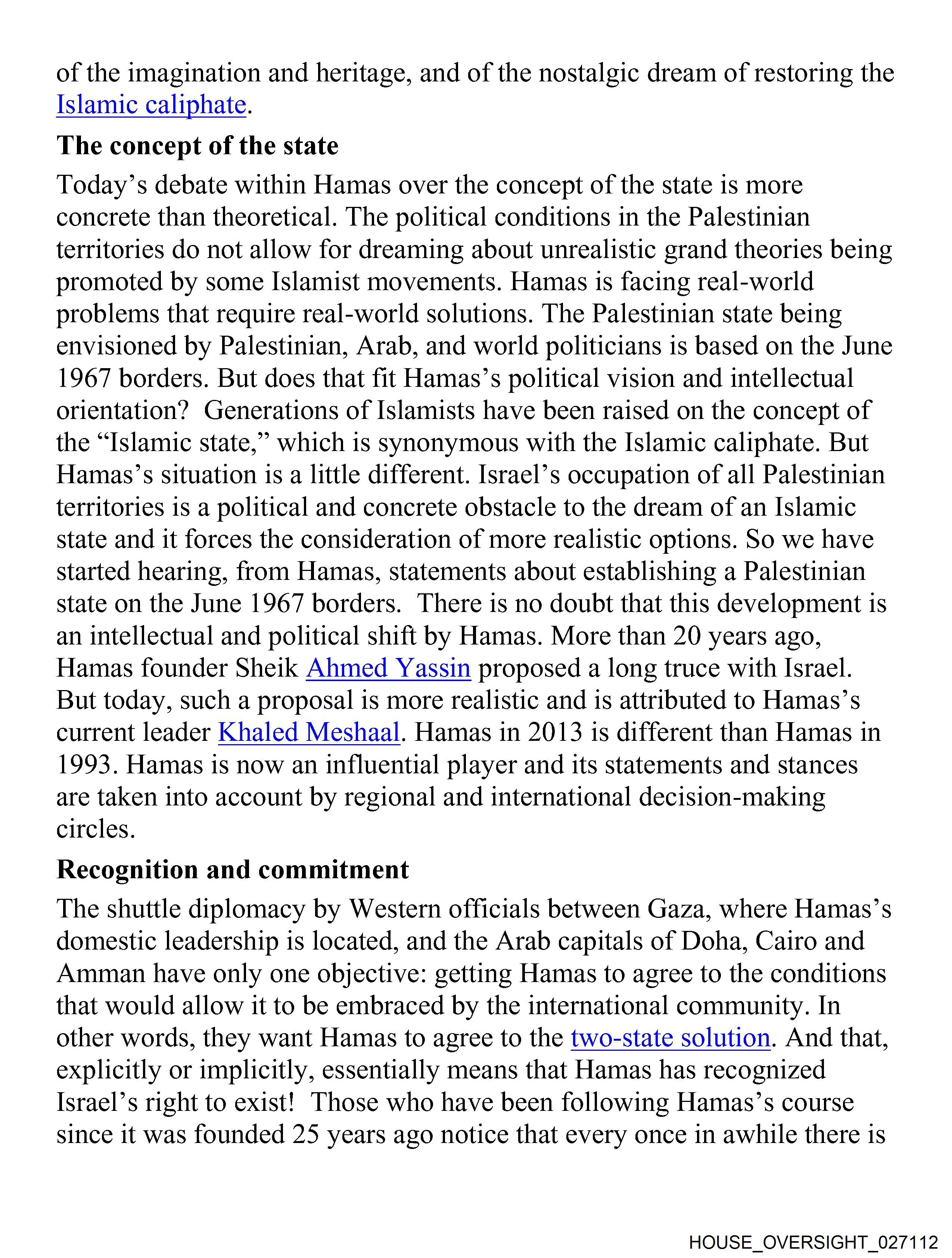 current leader Khaled Meshaal. Hamas in 2013 is different than Hamas in