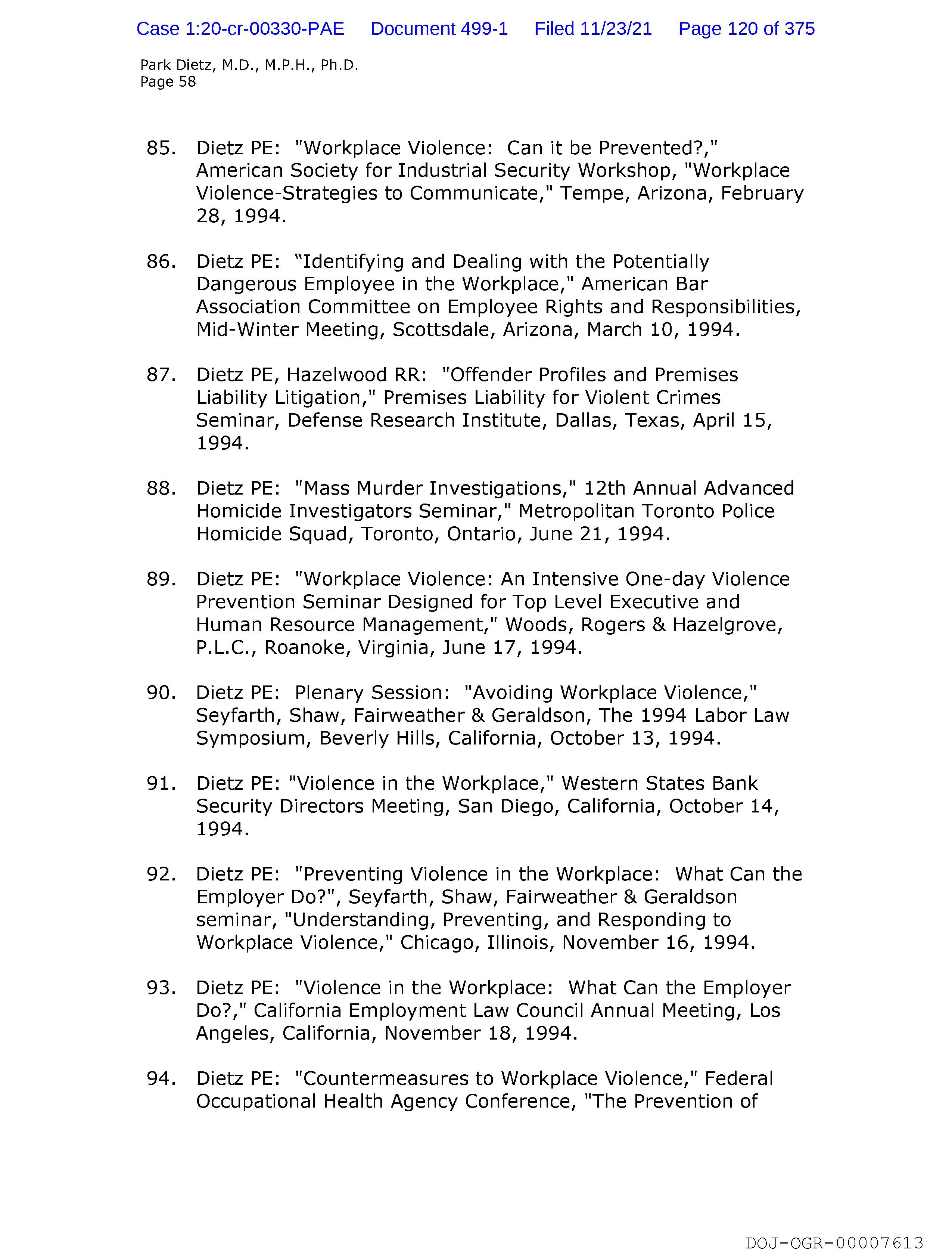 90. Dietz PE: Plenary Session: "Avoiding Workplace Violence,"